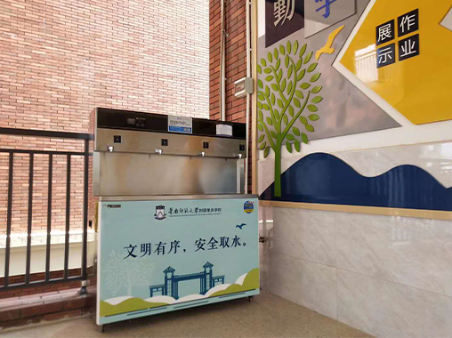 碧麗智能4.0飲水設備,四龍頭全溫開水飲水設備,專屬定制的面板,“文明有序,安全取水”的大標語,讓碧麗智能4.0飲水設備在華南師范大學附屬肇慶學校樓道里格外顯眼。